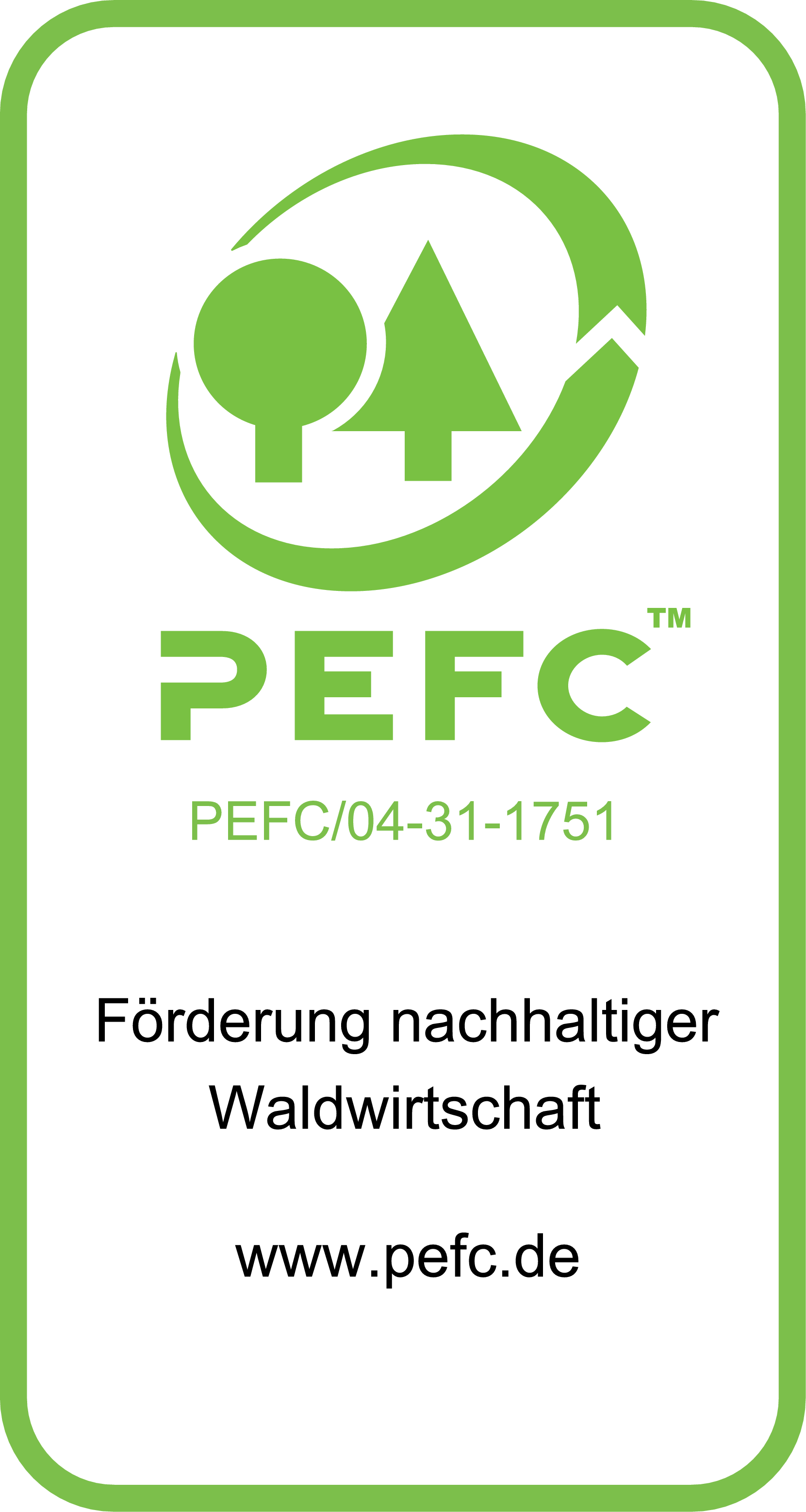 Das PEFC-Gütesiegel steht für nachhaltige, pflegliche und verantwortungsbewusste Waldbewirtschaftung. So bleiben unsere Wälder auch zukünftigen Generationen erhalten, als Lebensgrundlage, Arbeitsplatz und Erholungsraum. Ziel ist es, die Waldbewirtschaftung ständig zu verbessern, den Wald zu erhalten sowie seine positiven Wirkungen auf die Umwelt zu sichern. Gerade PEFCTM verkörpert den ganzheitlichen Ansatz der Nachhaltigkeit und hat den integrativen Naturschutzgedanken verinnerlicht. PEFCTM maximiert nicht einen Nachhaltigkeitsaspekt zu Lasten der anderen, sondern garantiert aufgrund seiner Entscheidungsstrukturen und Standards die Integration aller drei Komponenten in den zertifizierten Wäldern.